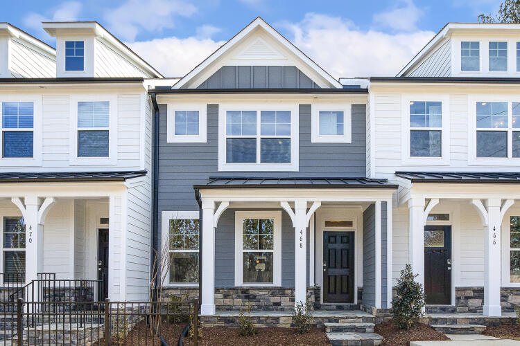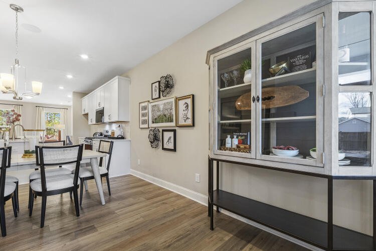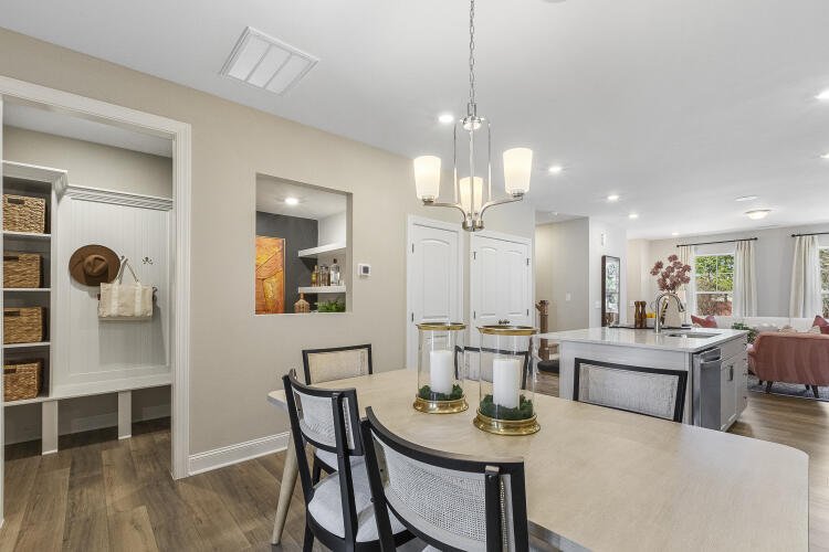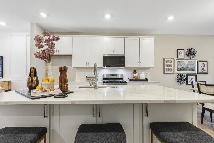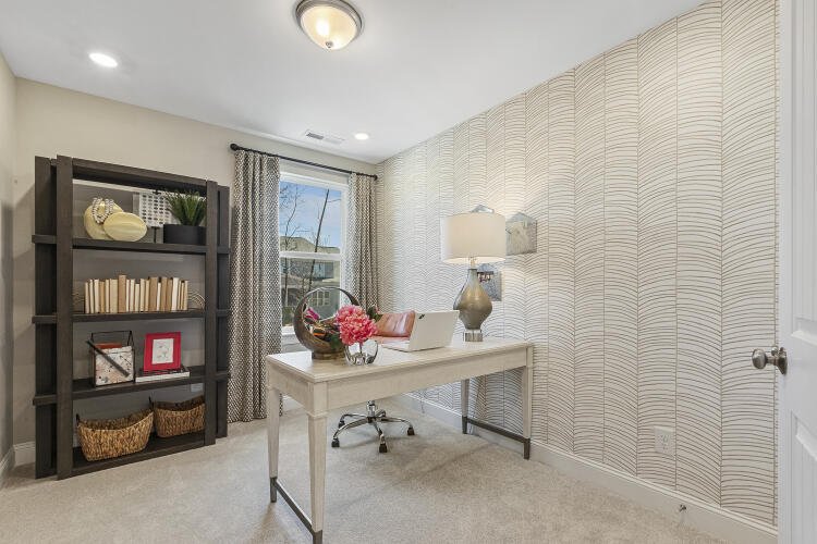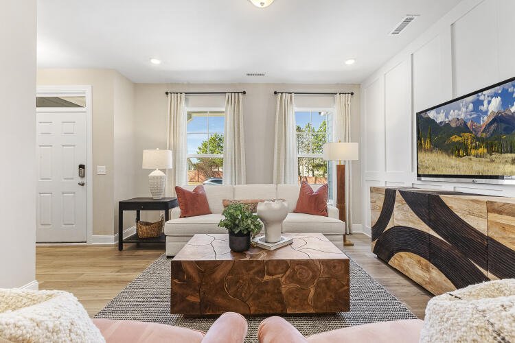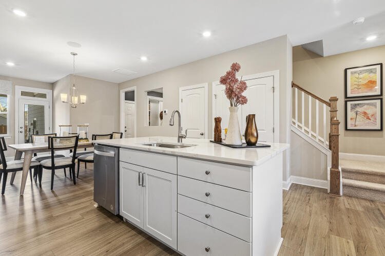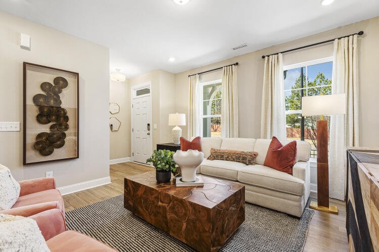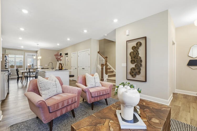 The Bluffton is a two-story, three-bedroom, two-and-a-half-bath townhome with a one-car, rear-load garage, spacious and open family room, kitchen with island and pantry, separate dining area, cozy nook which is perfect for a first-floor office area, and covered rear porch. All three bedrooms and laundry are on the second floor and the primary suite features a shower and dual walk-in closets.